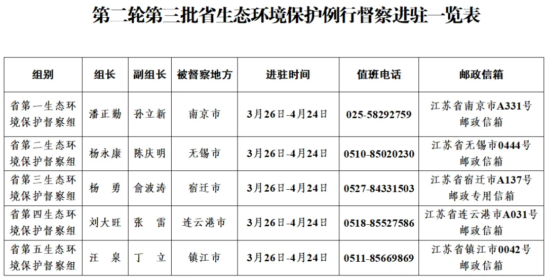 为贯彻落实习近平生态文明思想,持续深入打好污染防治攻坚战,根据《江苏省生态环境保护督察工作规定》,经省委、省政府批准,第二轮第三批省生态环境保护例行督察全面启动。省委、省政府组建5个省生态环境保护督察组(以下简称督察组),分别对南京、无锡、宿迁、连云港和镇江市开展督察进驻工作。具体如下: