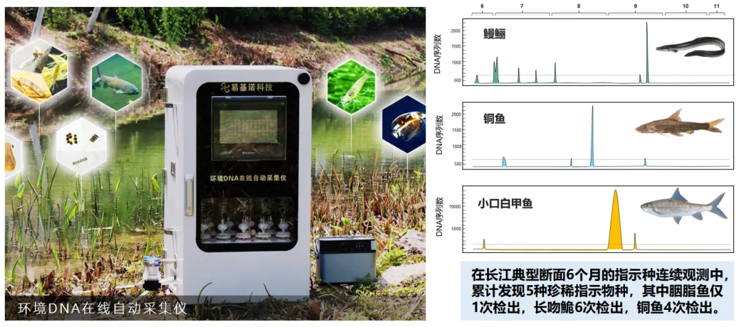 据项目负责人、南京大学教授张效伟介绍,环境DNA在线自动采集仪,可以通过自动连续采集野外环境水样,收集生物DNA。这些DNA来自各类生物,比如鱼类、鸟类、浮游植物、底栖动物等。而智慧分析系统,更像一个“超级大脑”,可实现环境DNA实验室自动化检测与智能化分析诊断,高效获悉环境中生物多样性种类和数量、水生态健康状况等信息。从根源上解决传统检测方式步骤繁琐、依赖专家、准确性差等问题,真正实现“高分辨率水生态的精准感知”“一瓢水识一池鱼”。