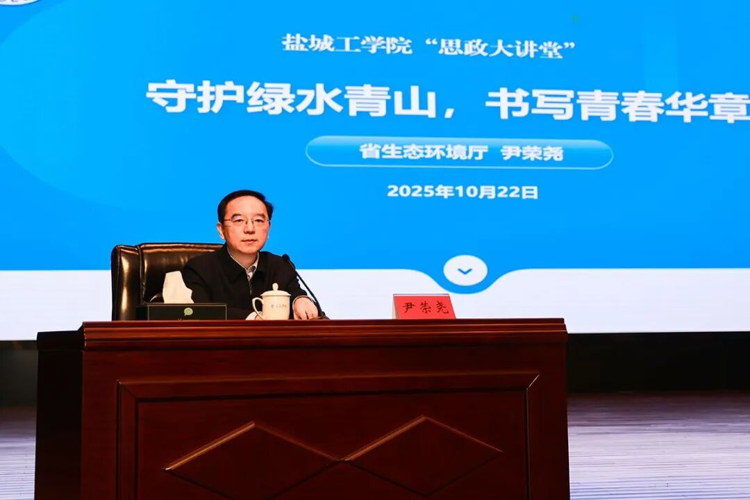 10月22日,江苏省生态环境厅党组成员、副厅长尹荣尧在盐城工学院以《守护绿水青山,书写青春华章》为题讲授思政课,校党委常委、副校长王伟主持。江苏省环境保护宣传教育中心有关负责同志,盐城工学院相关部门负责同志以及师生代表等500多人参加。