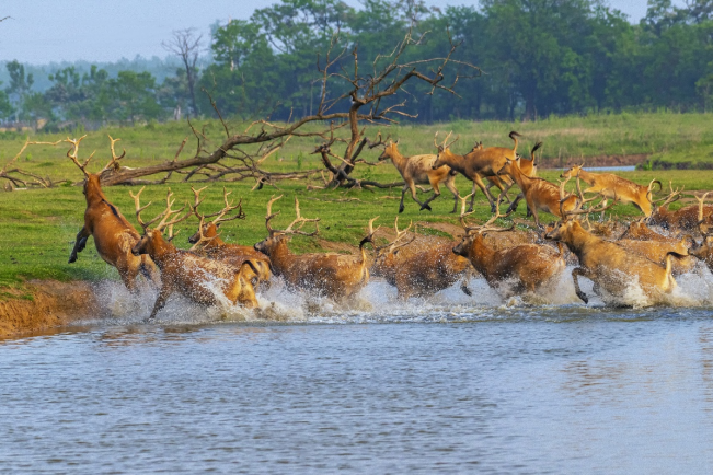 保护区成群结队的麋鹿 周晨曦 摄