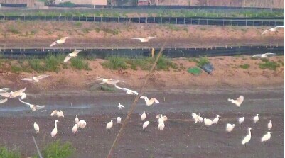 大量白鹭在浅塘里嬉戏。