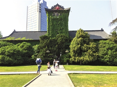 小长假第一天,校友、外地游客,让北大楼成了热门景点。处处是自拍杆,背景是绿意盎然的古朴大楼。