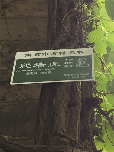 它们构筑了南京城现存最早的一批垂直绿化,遒劲有力的藤蔓上,可以看到南京市园林局去年12月挂上的“南京市古树名木”铭牌,名称“爬墙虎”,“葡萄科”“地锦属”;编号从277-1到277-5,树龄是“96年”,今年97了。