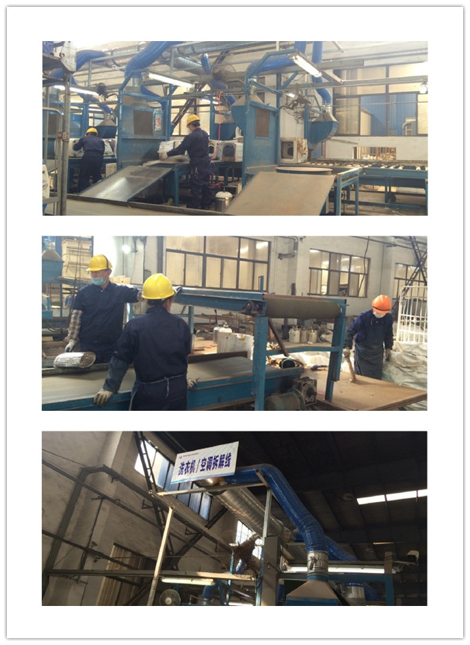 小环现在正在洗衣机/空调拆解车间。工作人员正在人工拆解洗衣机,将电机、机壳、线路板进行分类,这个过程采用的是干式吸尘器清理主机表面灰尘,可以减少粉尘的产生。