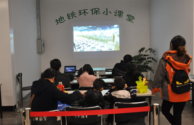 地铁环保小课堂播放环保公益宣传片吸引了家长和孩子们