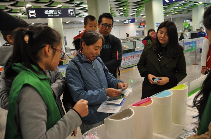车站内设置了非常有趣的环保知识小翻版,精选了16道有关电子废物知识的小问答,只要答对问题就能获得奖品。同时,市民朋友填写关于电子废物规范化回收的调查问卷,也能获得精美礼品一份。现场还设置了绿钥匙智能资源回收箱,可自助回收旧衣物、报纸、易拉罐、手机等,目前在南京已有40多个小区使用该回收箱。绿博园环保车站拥有全国首个设在地铁站内的环保小课堂,小课堂内播放电子废物规范化回收科普视频,向过往市民宣传电子废物的相关知识,如随意丢弃电子废物对水、大气、土壤和人体健康产生的危害,电子废物的哪些部件中有值得回收再利用的资源等。